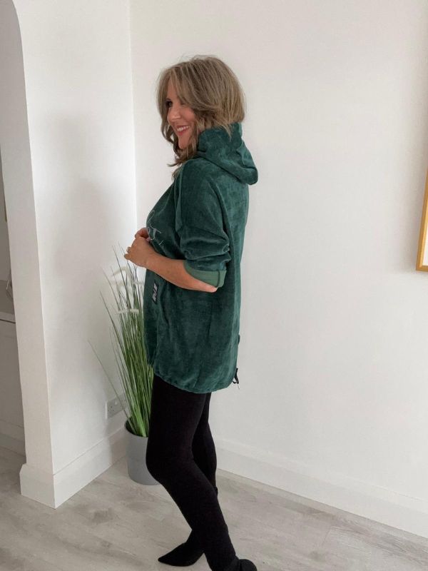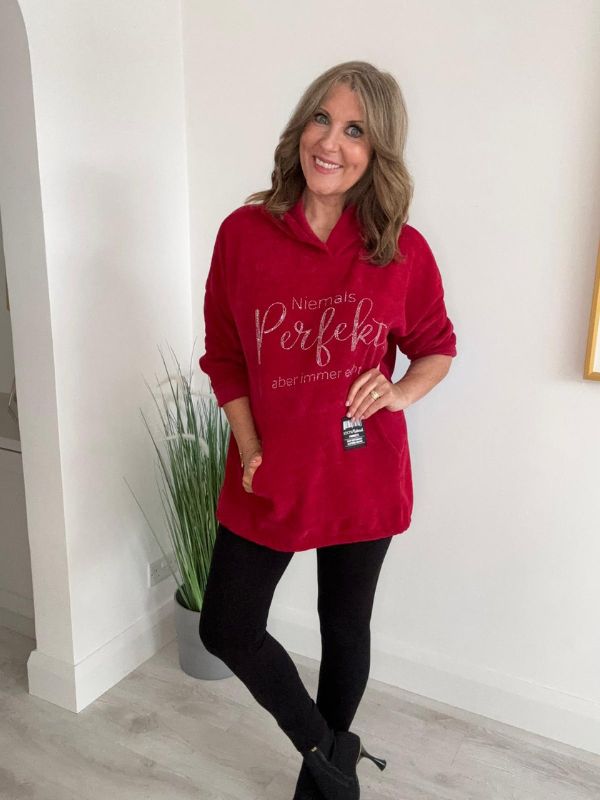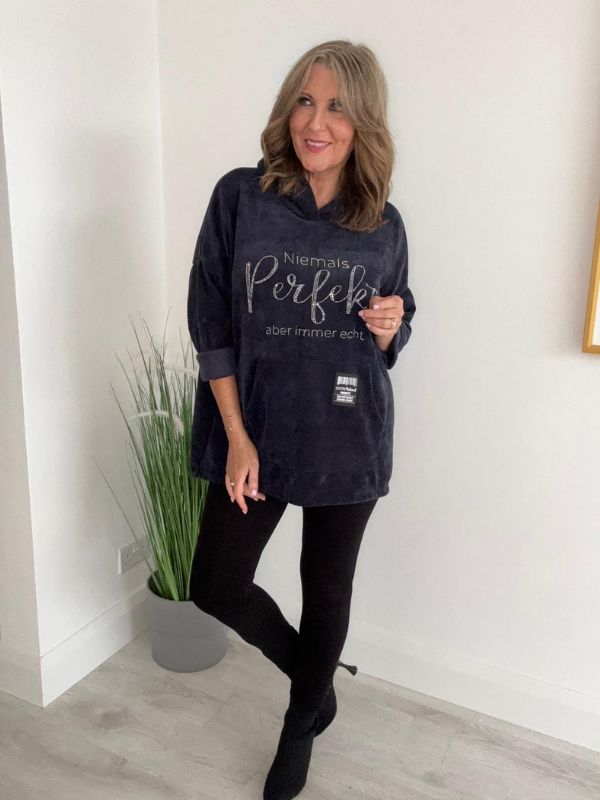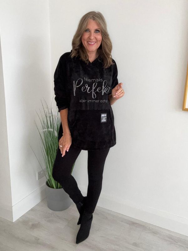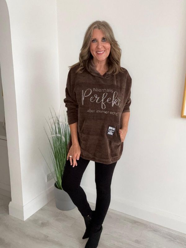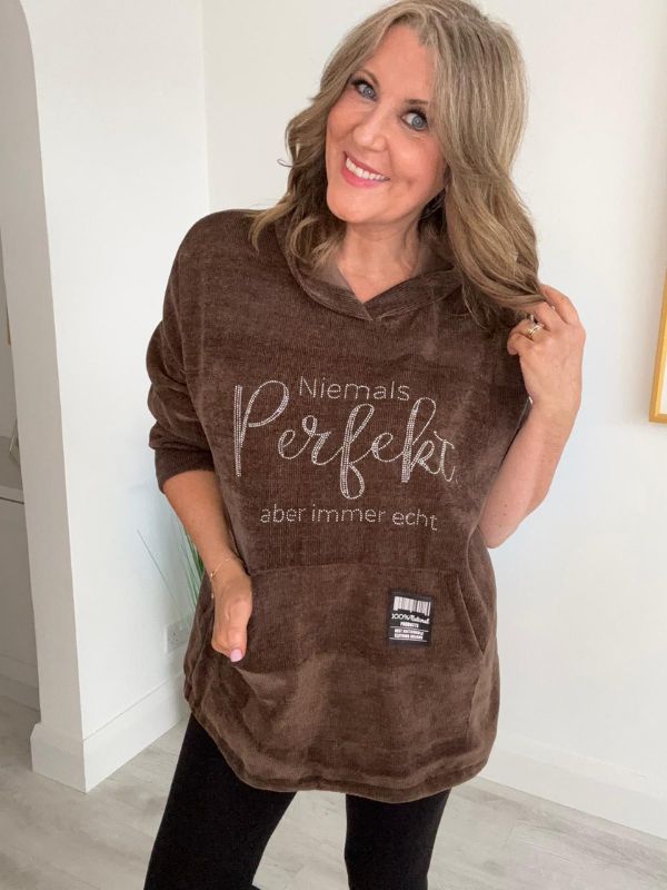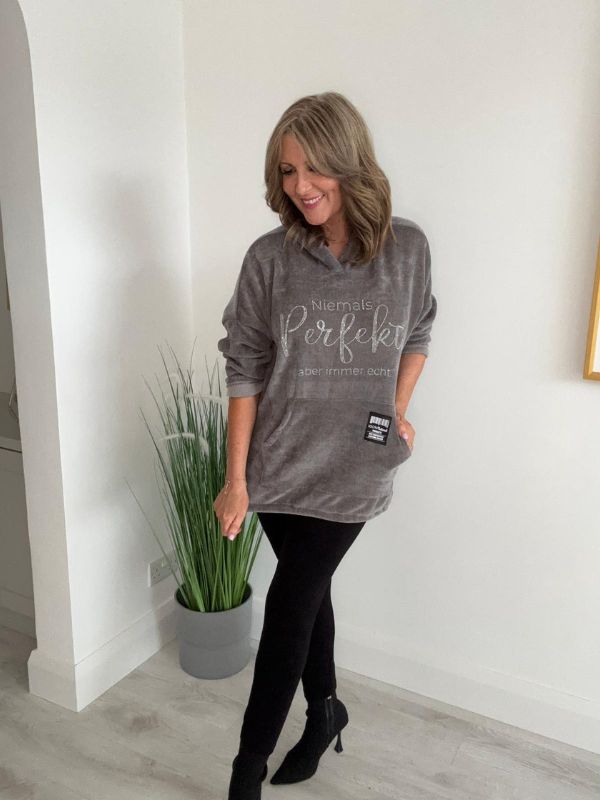 Stay stylish and comfortable with our “Niemals Perfekt aber immer echt” oversized hoodie — a perfect blend of cozy and chic! Made from soft, velvety fabric, this hoodie features a relaxed fit with a kangaroo pocket and subtle shimmer lettering on the front. Ideal for everyday wear, lounging, or layering on cool days.