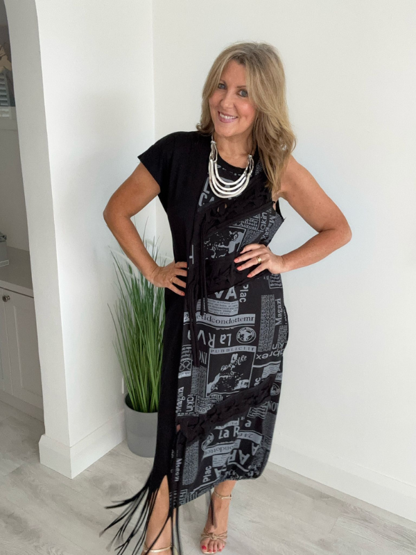 Make a statement in this eye-catching black dress featuring bold newspaper print detailing. The asymmetric design blends modern street style with comfortable elegance, making it perfect for both casual days out and edgy evening looks. Crafted with soft, breathable fabric, this dress drapes beautifully and includes a unique drawstring detail for added flair. Pair it with trainers for a chic daytime look or dress it up with heels and bold accessories.