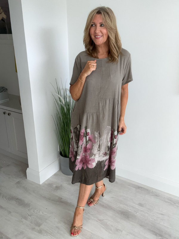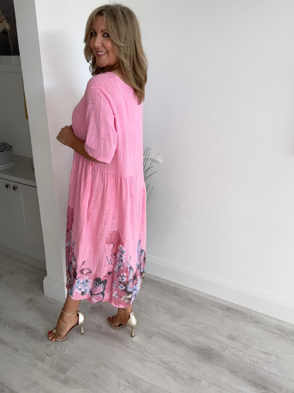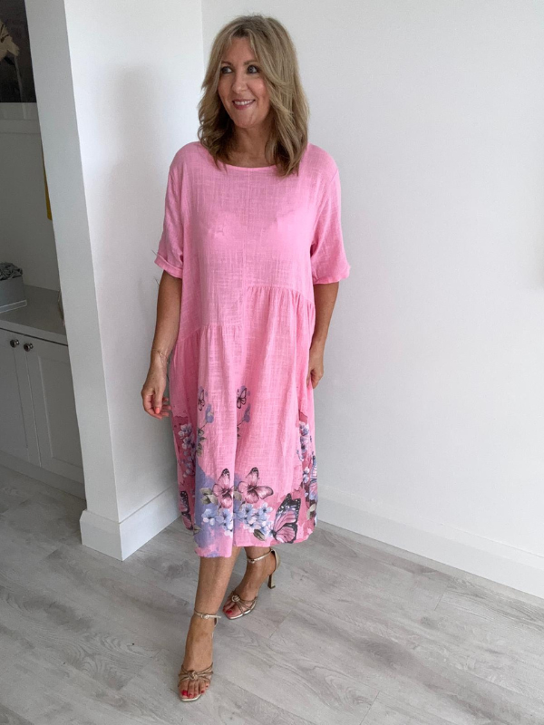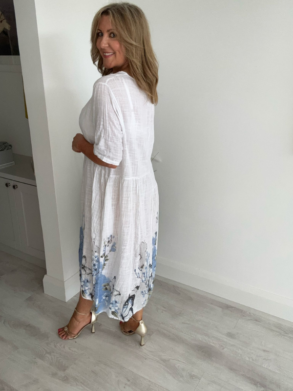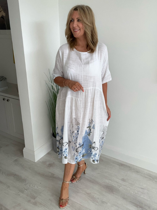 Bring charm and comfort to your everyday wardrobe with this Floral Hem Crinkle Cotton Midi Dress, designed with a flowy silhouette and soft fabric. Featuring delicate blue-toned floral and butterfly prints at the hem, this dress blends romantic detail with breezy elegance — perfect for summer events, vacations, or relaxed weekends.