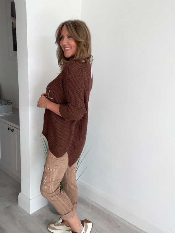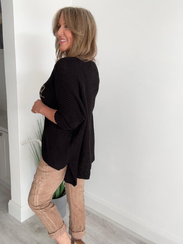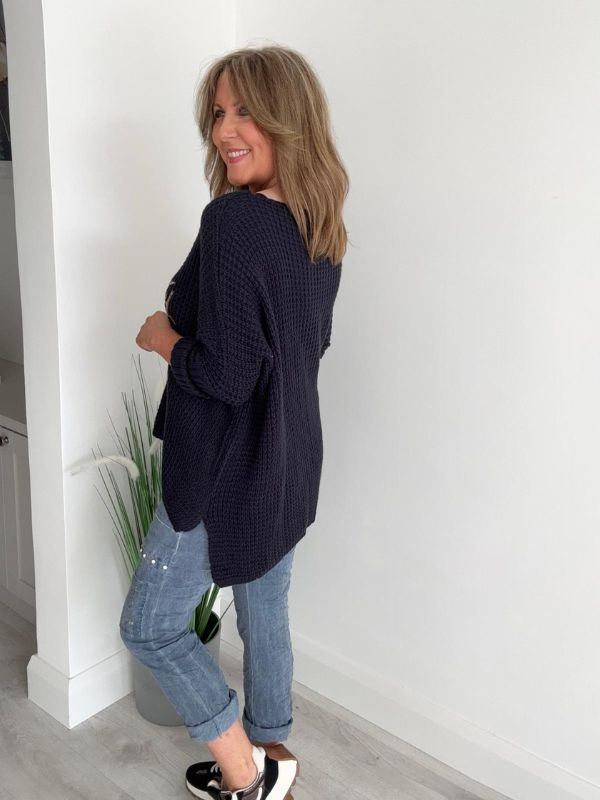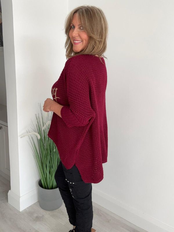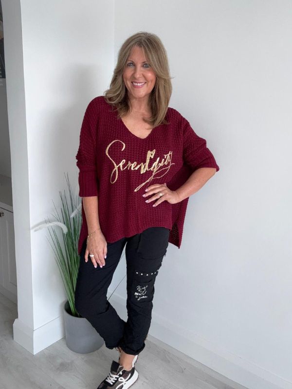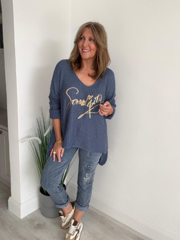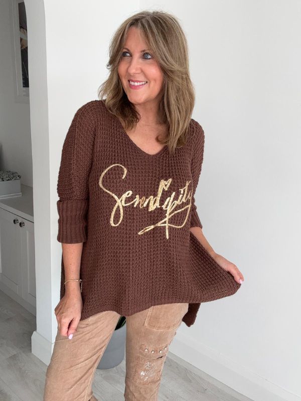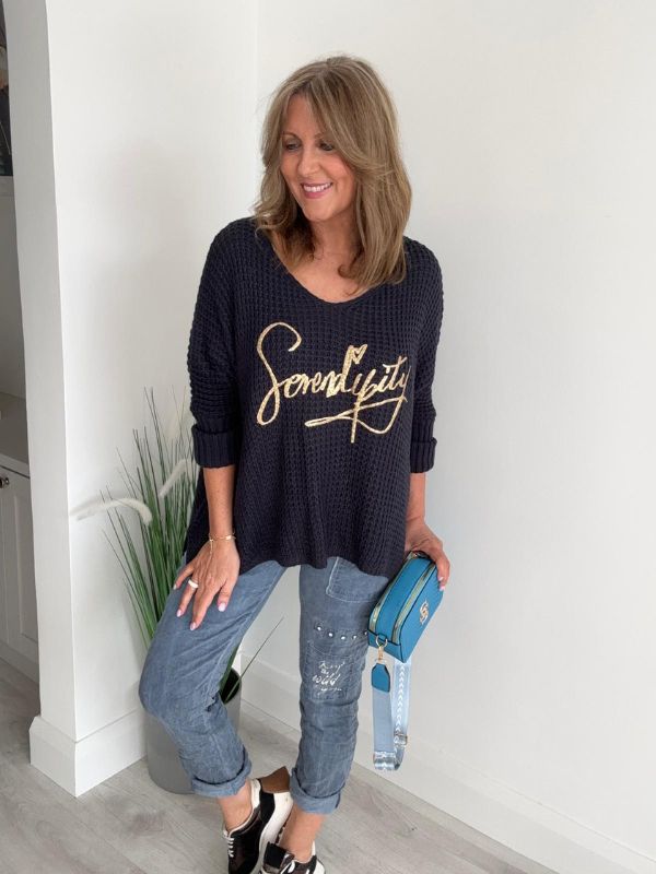 Stay effortlessly stylish and comfortable in our Serendipity Oversized Jumper. Designed in a soft waffle knit with a flattering relaxed fit, this jumper is perfect for layering all year round. The gold “Serendipity” script adds a touch of glamour, making it easy to dress up or down.
