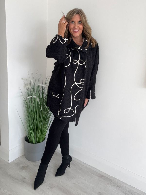 Step out in style with this chic black oversized coat, featuring a soft textured finish and eye-catching white swirl embroidery. Designed for both comfort and elegance, this coat is perfect for layering over your favourite outfits during the cooler months. The relaxed fit makes it flattering for sizes UK 14–22, while the classic black shade ensures it pairs effortlessly with any wardrobe.