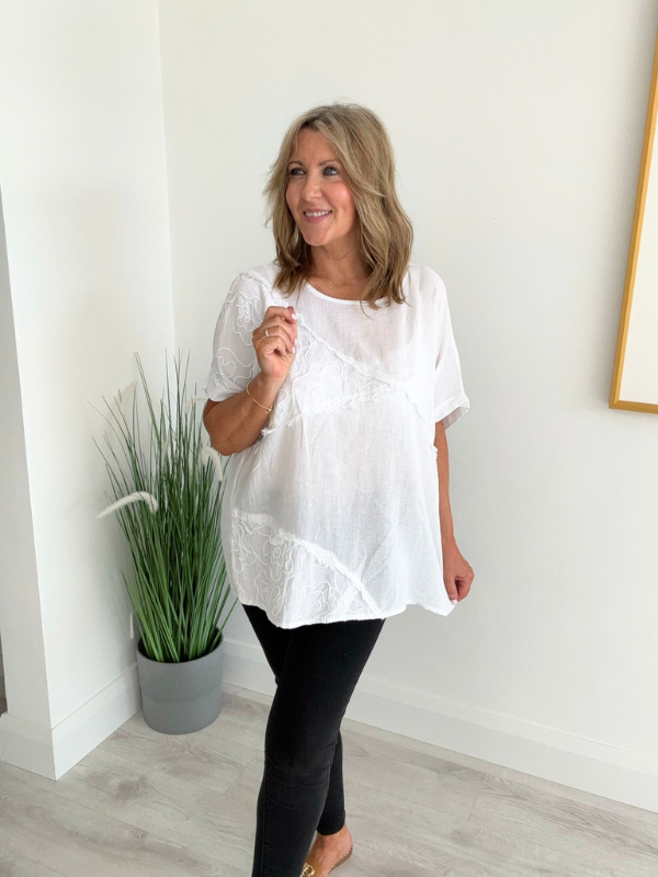 Stay cool and stylish with our brushed cotton and linen embroidered top. Featuring short sleeves, a relaxed fit, and breathable fabric, this tee is a perfect choice for effortless everyday wear. Designed with a fashion-forward edge, it’s easy to pair with jeans, skirts, or even layered under a blazer. Free size fits UK 8–18.