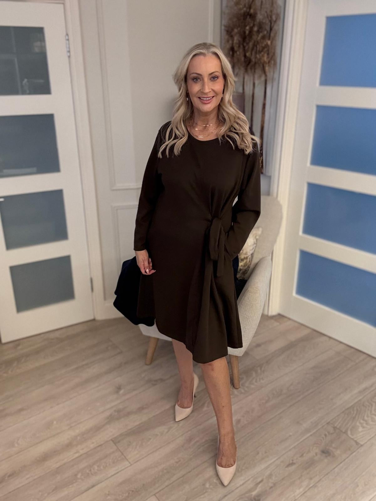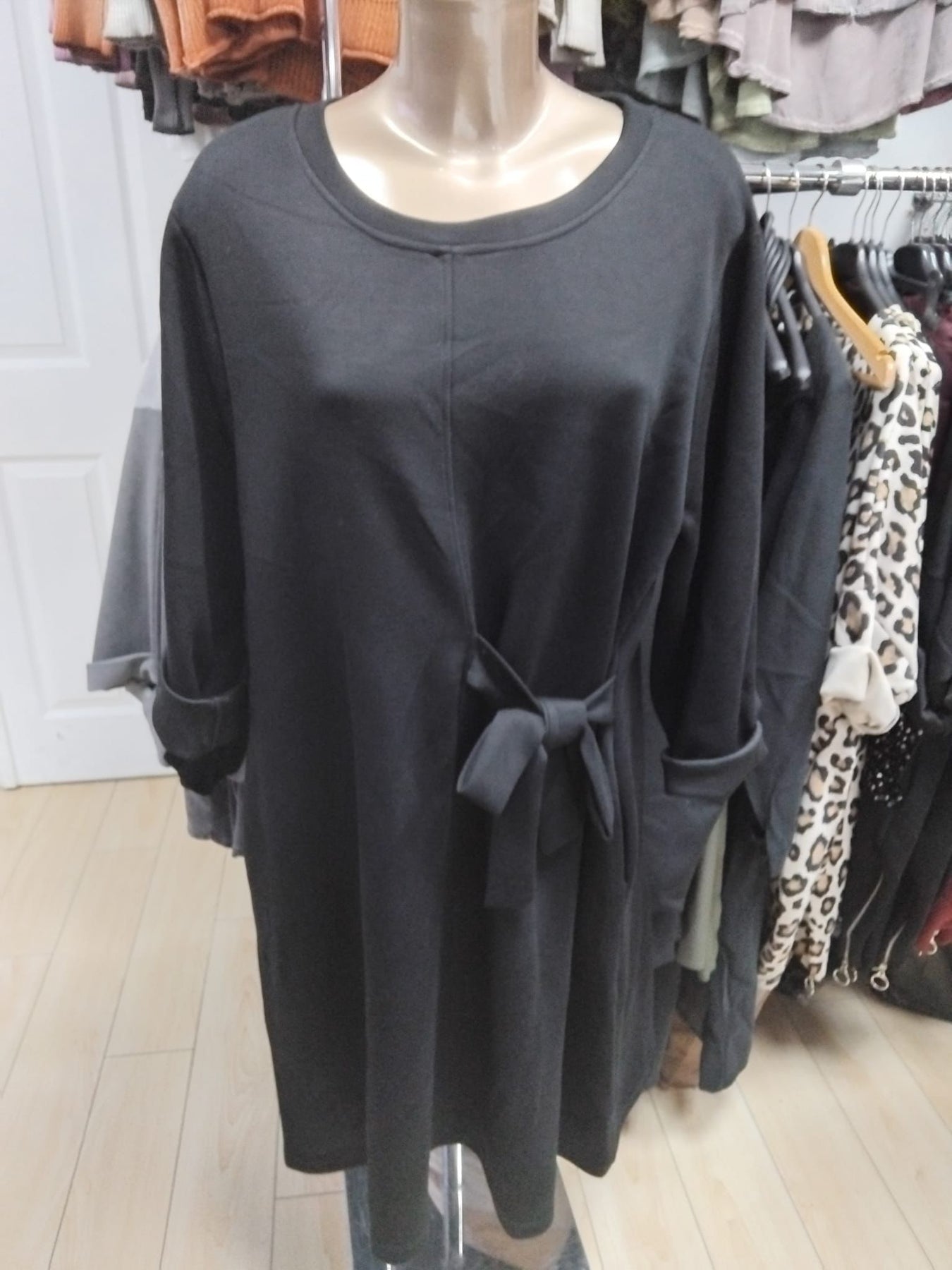 A simple round neckline, rolled sleeves, and a chic side tie add subtle structure and shape while keeping the look minimal and modern. Pair it with boots, trainers, or leggings for an easy, stylish outfit you can wear anywhere.