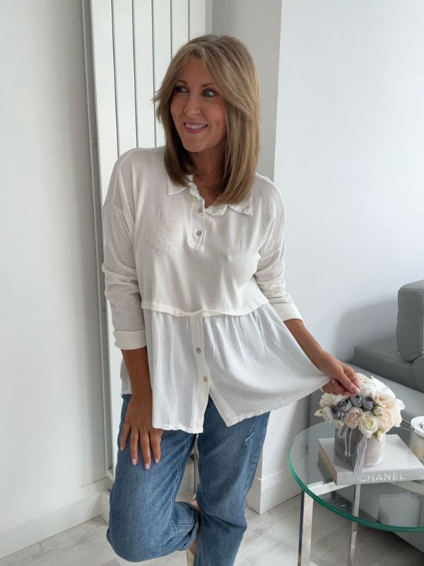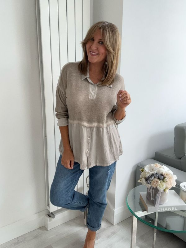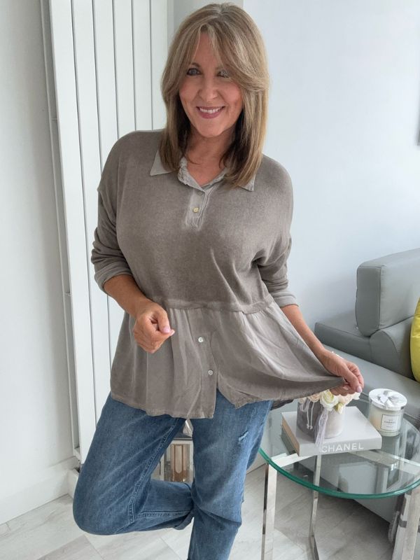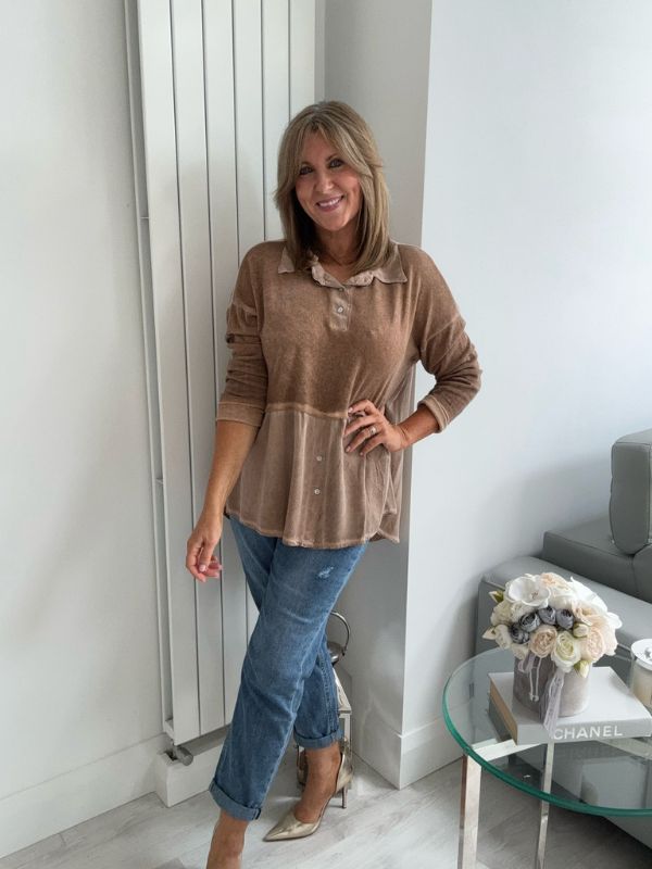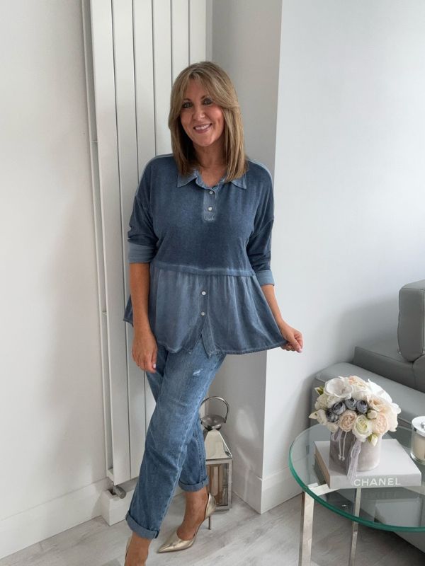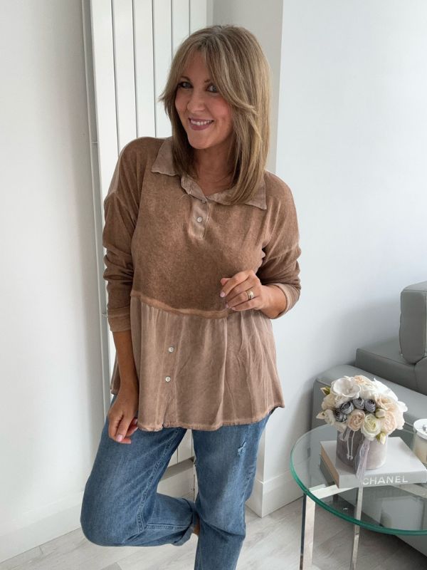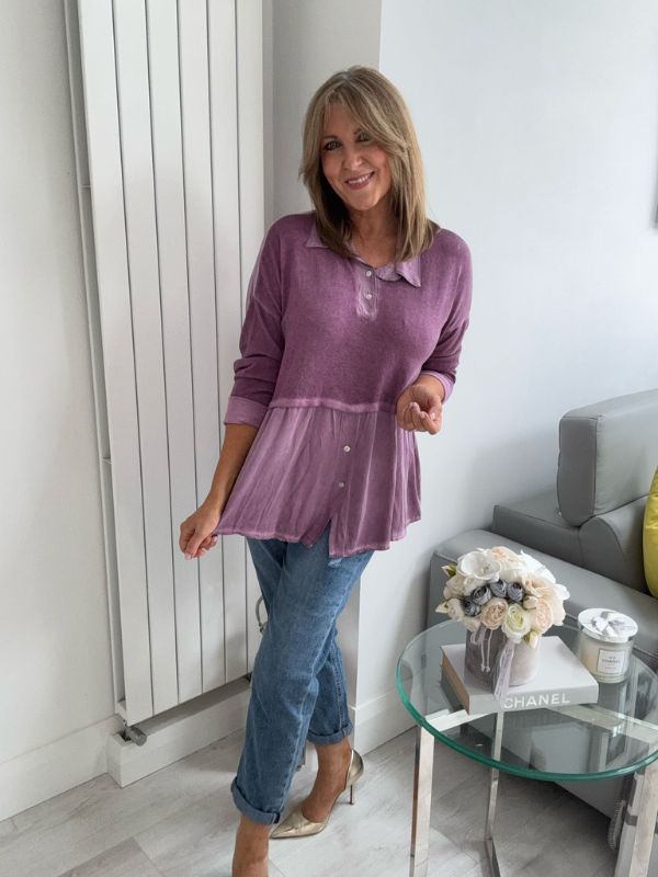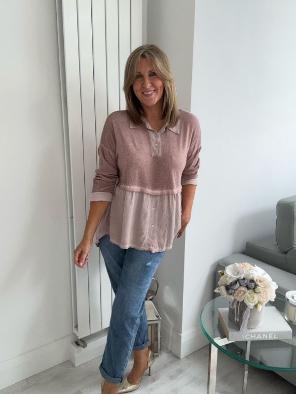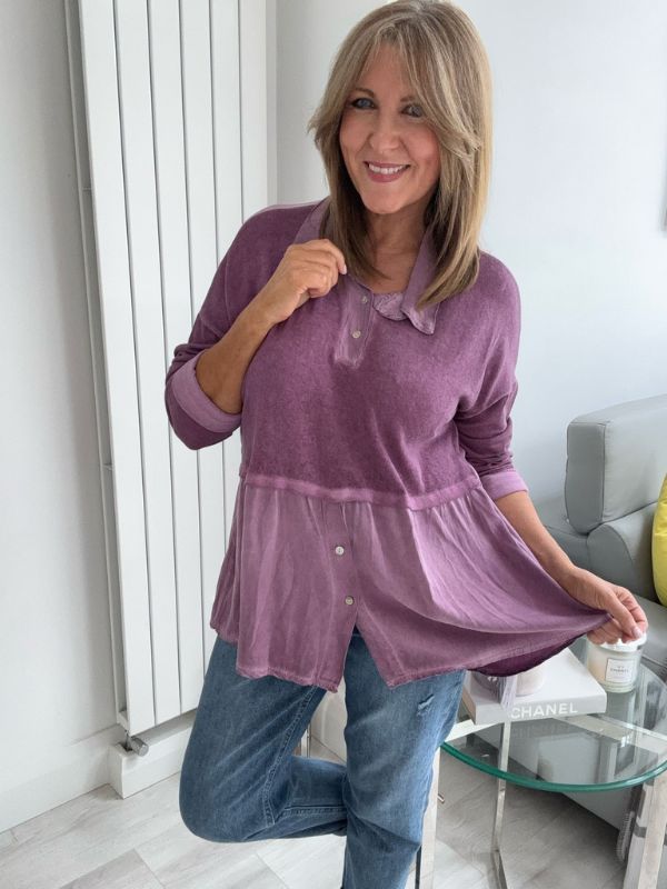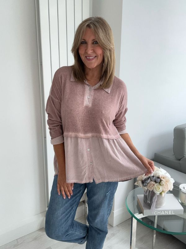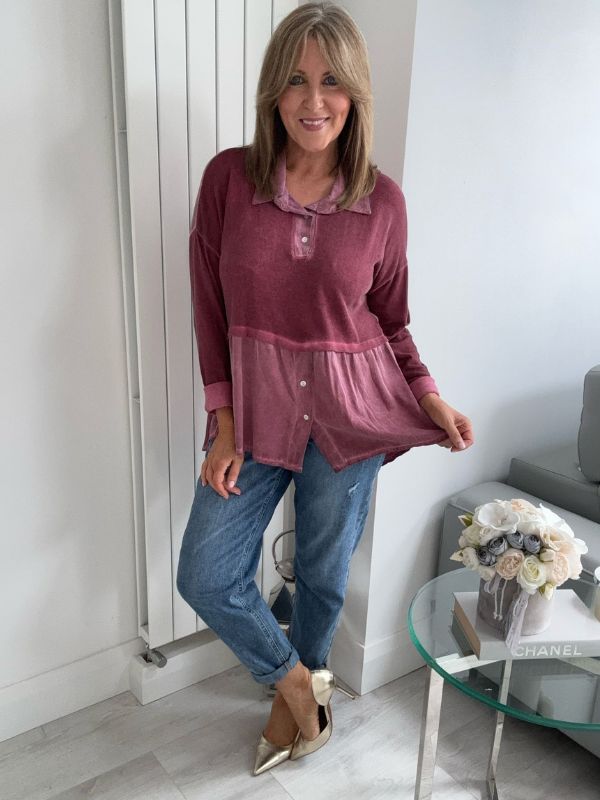 Effortlessly chic and comfortable, this vintage rose blouse features a stylish two-tone design with a soft velvet-texture finish. The top includes subtle button detailing on the bodice and hem, a relaxed peplum silhouette for flattering movement, and a classic collar for a touch of elegance. Perfect for layering or wearing on its own — pair with your favorite jeans or trousers for an easy, polished look.